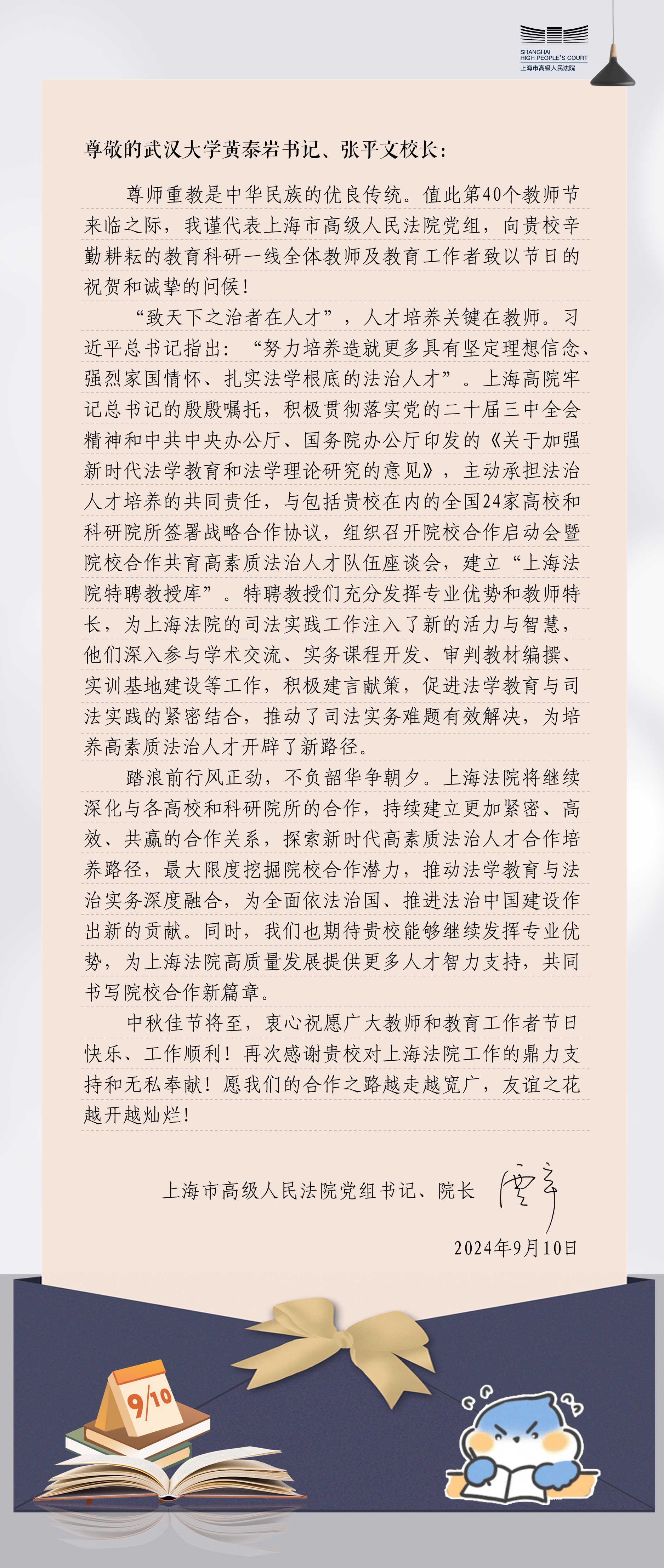 9月10日是国家第40个教师节,当天,上海市高级人民法院党组书记、院长贾宇代表该院向我校全体教师和教育工作者致以节日的祝贺和诚挚的问候。贾宇院长高度评价上海市高级人民法院和四人麻将玩法