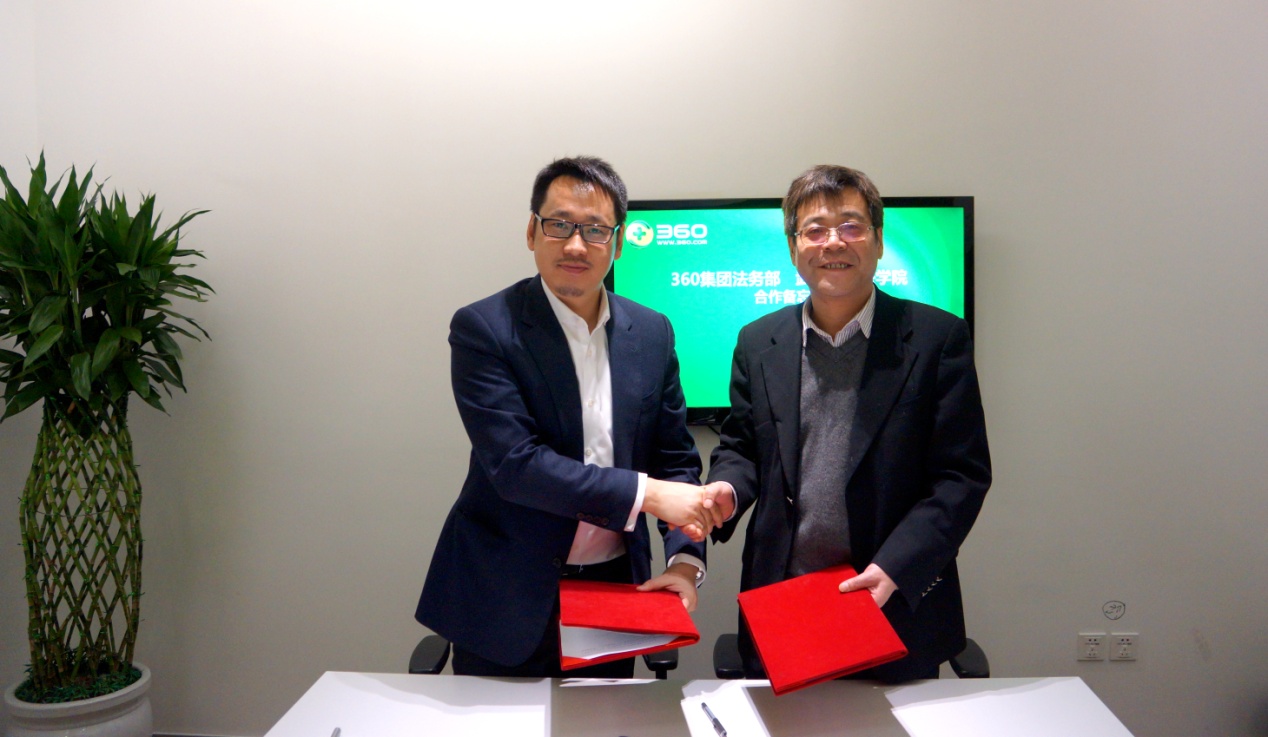 院长冯果教授、副院长黄志雄教授前往奇虎360公司,同360公司副总裁兼总法律顾问许坚先生、360公司法律研究院总监赵军先生等人就双方在网络法领域的合作进行洽谈,冯果院长与许坚副总裁兼总法律顾问共同签署了《北京奇虎科技有限公司与四人麻将玩法