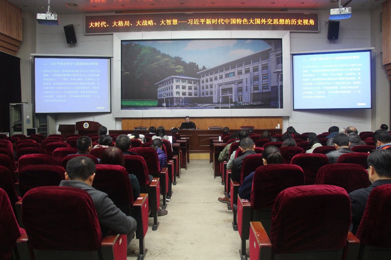 学习和贯彻党的十九大精神宣讲报告会在120报告厅举行,会议由院党委书记孙德元主持。本次报告会题为《大时代、大格局、大战略、大智慧—习近平新时代中国特色大国外交思想的历史视角》,我校人文社科资深教授、学校十九大精神宣讲团成员、著名历史学家、国家领土主权与海洋权益协同创新中心主任、首席专家胡德坤为四人麻将玩法