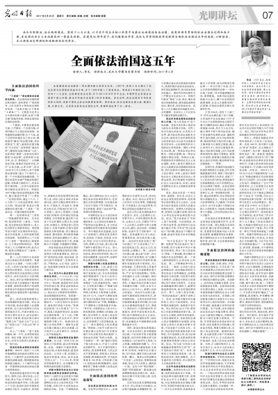人文社科资深教授李龙先生在学校樱顶老图书馆举行了以“依法治国这五年”为主题的学术讲座。6月25日,《光明日报》第七版整版刊登李龙教授题为《全面依法治国这五年》的讲座内容,全文如下: