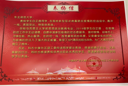2019级本科生白芷茵,来自内蒙古。2020年春节,当我还享受在过年的喜庆氛围中,一场突如其来的新型冠状病毒引发的肺炎疫情从武汉迅速蔓延至全国,牵动着14亿中国人民的心。我每天通过新闻关注着疫情的信息,每天都能听到那些奋战在一线的工作者们的感人故事,也看到了就在我身边的社区工作人员的辛苦,虽然我所在的地区没有感染病例,但是社区工作人员们从大年初一开始上班,之后的一个多月以来就一直没有休息过,无论周六周日。而我觉得自己身为共青团员,既然上不了一线,那就应该在自己力所能及的范围内承担责任,帮助社区工作人员分担一些工作,肩负起青年人的使命担当。于是,等到社区招募志愿者时,我想也没想就报了名,父母也都特别支持我。