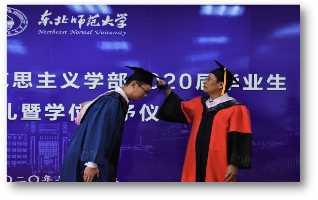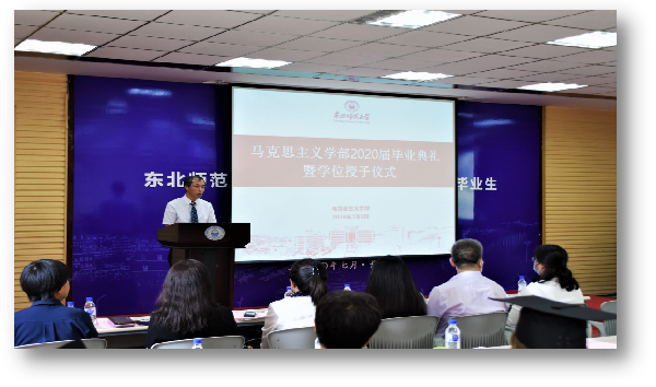 部长庞立生在完成对50余名主会场学生代表的学位授予后,进行了致辞。他说,在每个人一生成长中,总会有一些特别的经历,这场特殊的毕业典礼将会给我们每个人留下格外深刻的记忆。庞老师谈到,大学的学习,不仅使我们获得了一种专业性的认知概念框架,也同时给予我们一种内在超越的人生态度。
