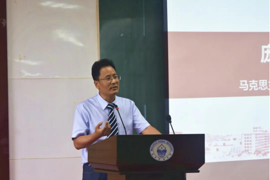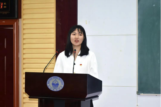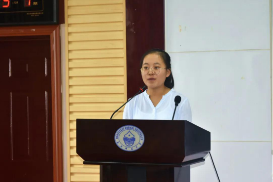 2019级思想政治教育专业博士生姜波同学作为在校生代表发言。她建议20级新生在马部“感受大学的美好”、“感受老师的指导”、“感悟成长的真谛”;拥有专业的“硬实力”和综合的“软实力”;结交三友:书籍、同辈、自己。