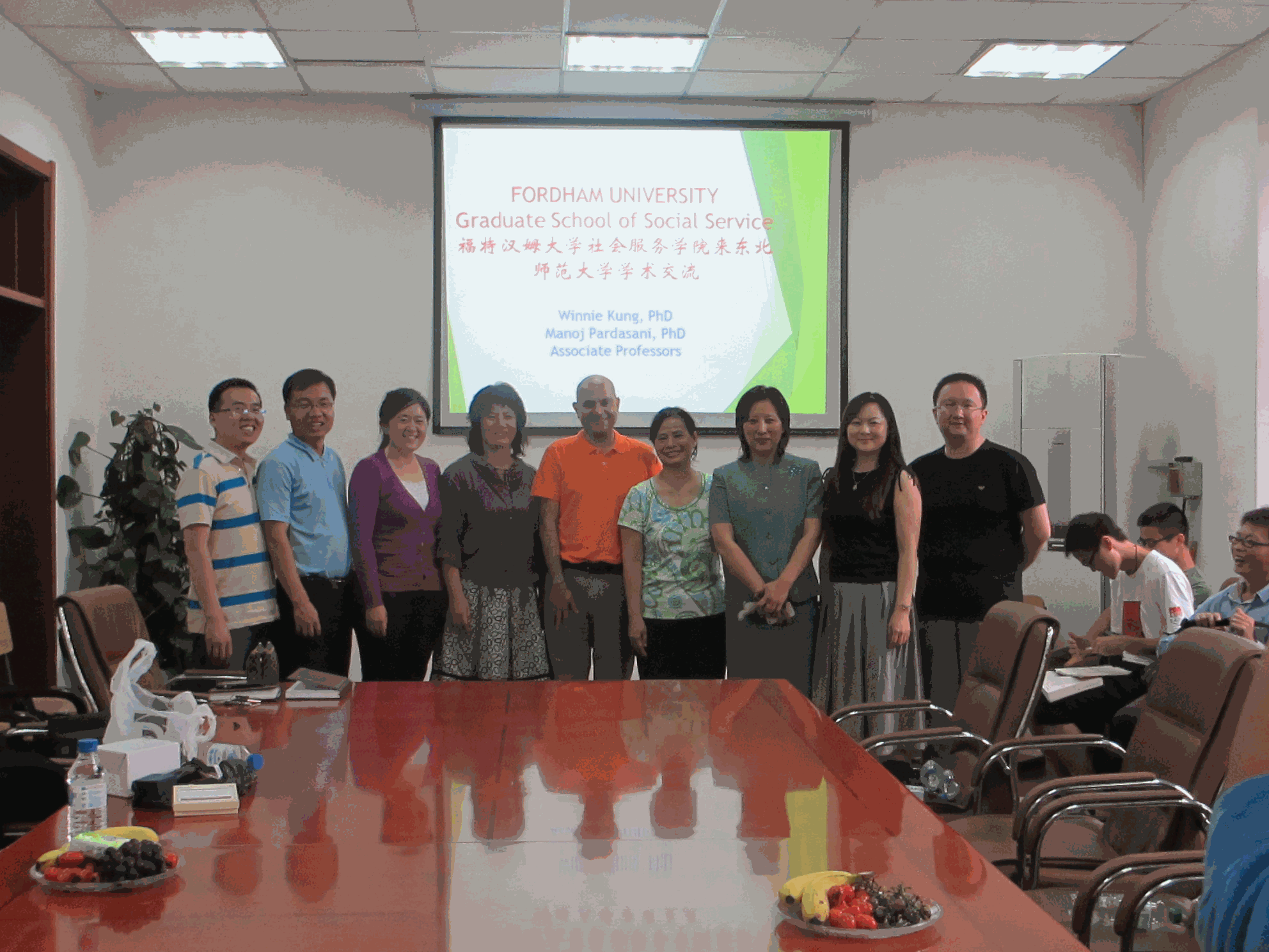 二楼会议室举行。美国福特汉姆大学社会服务研究院的龚惠明教授和Manoj Pardasani教授做了“美国社会工作教育的基本现状及发展趋势”的报告。