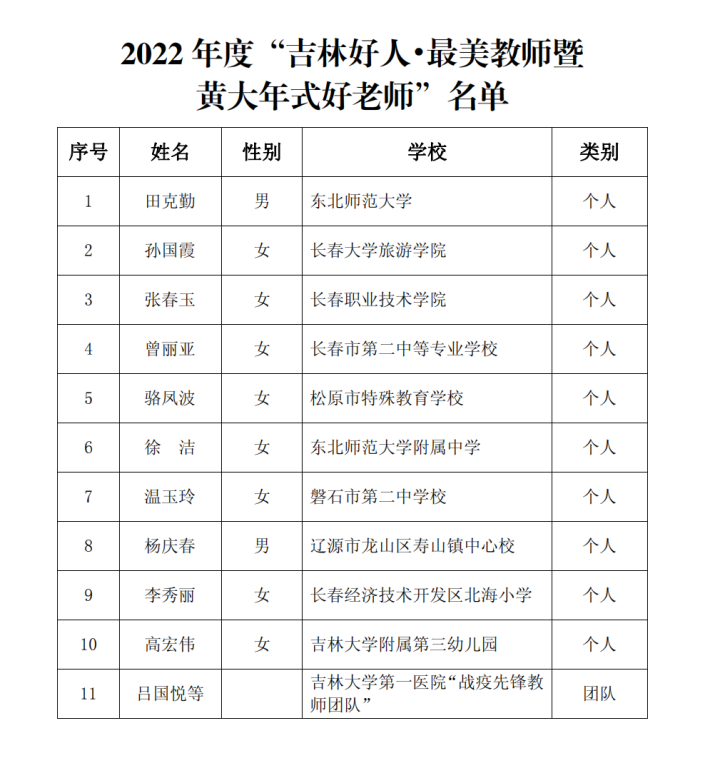 此次评选经各地各校推荐,推荐人选所属教育部门师德考察,专家组初选、复选、终选,省教育厅党组会审议通过、公示,确定了10名同志及1个团队为2022年度“吉林好人·最美教师暨黄大年式好老师”。