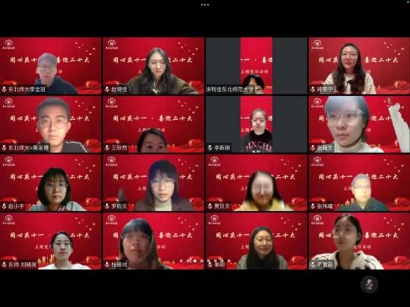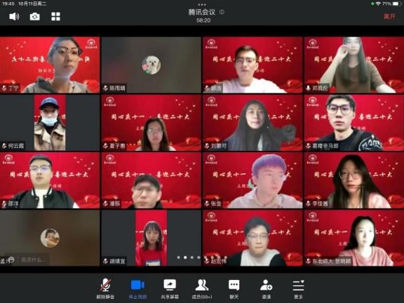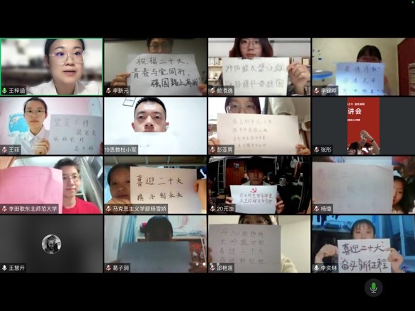 2021级研究生党支部于10月11日开展了“同心庆十一·喜迎二十大”主题党日活动。此次活动党支部采取线上学习方式,旨在推动基层支部迎接党的二十大宣传工作,进一步强化广大青年同志的理想信念教育,提高党员的政治素质和理论修养,增强支部活力、凝聚力。全体党员在国庆节期间针对“马克思主义理论研究名家讲坛第二季暨迎接二十大系列讲座”进行自主学习,并于10月11日对学习内容进行集体讨论,并由学生代表张金、赵宏伟、王奕昕、邵洋、陈雨晴根据不同主题的讲座分享了自己的学习心得,加深了同学们对于理论学习内容的理解和把握,党员、积极分子共计100余人在线参加。