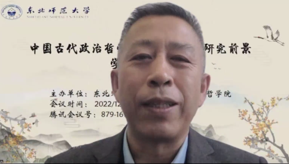 部长庞立生教授致辞,庞立生介绍了我校中国哲学学科的学术研究特点和发展方向,阐述了本次会议对中国古代政治哲学研究的积极意义及其当代价值,并预祝会议取得圆满成功。