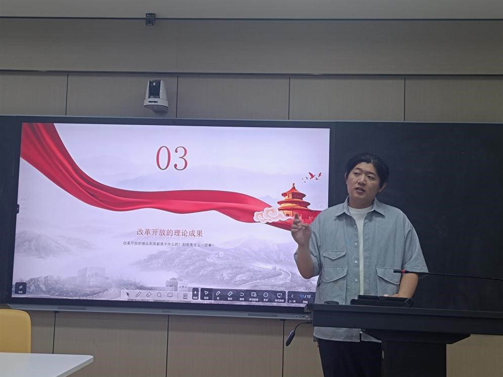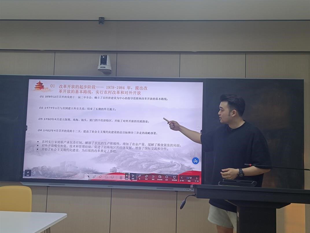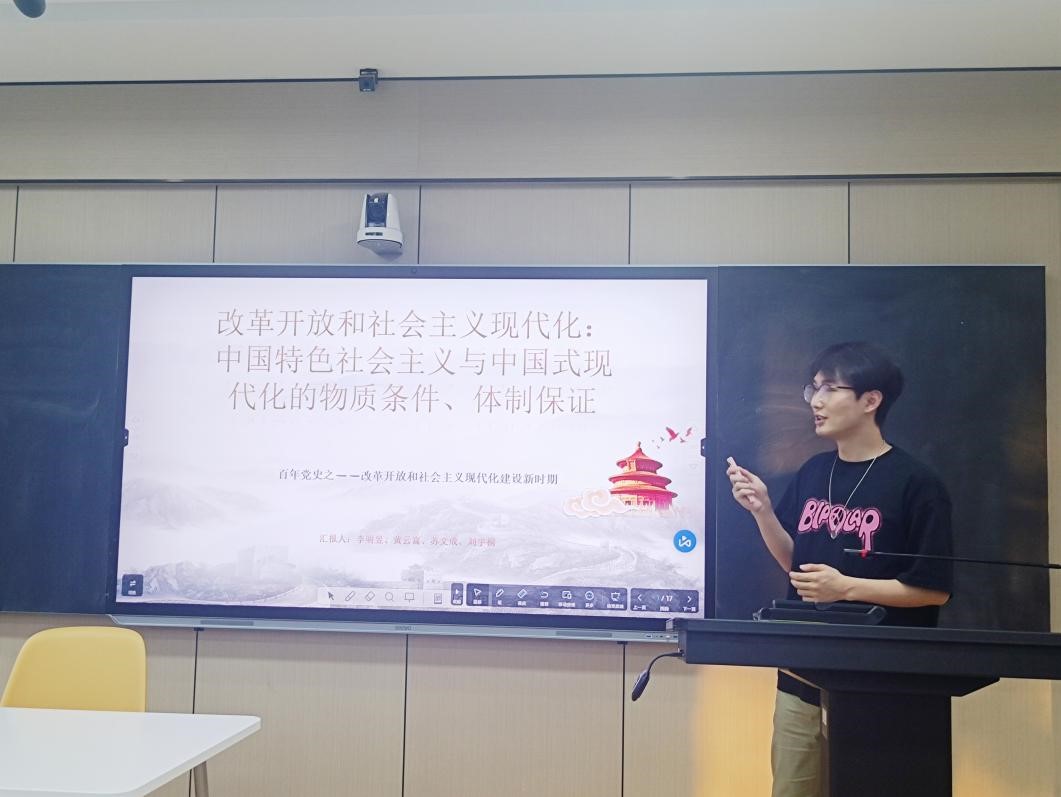 活动第三环节由社会工作专业的李明昱、苏文成、黄云嵩同学为我们讲述改革开放和社会主义现代化建设新时期的历史。“烈火焚身身不动,只缘使命在心中””待到山花烂漫时,她在丛中笑。”在社会主义建设时期,我们面临的是国内外的双重压力,对内百废待兴,对外强敌施压,我们经历过抗美援朝战争、经历过三年自然灾难。正是中国共产党带领人民不畏强权,不怕困难,坚持斗争和建设,使得我们完成了社会主义建设,进入到了一个新的发展阶段。在李明昱、苏文成、黄云嵩同学的带领下,我们一同追寻了中国特色社会主义与中国式现代化的建设。