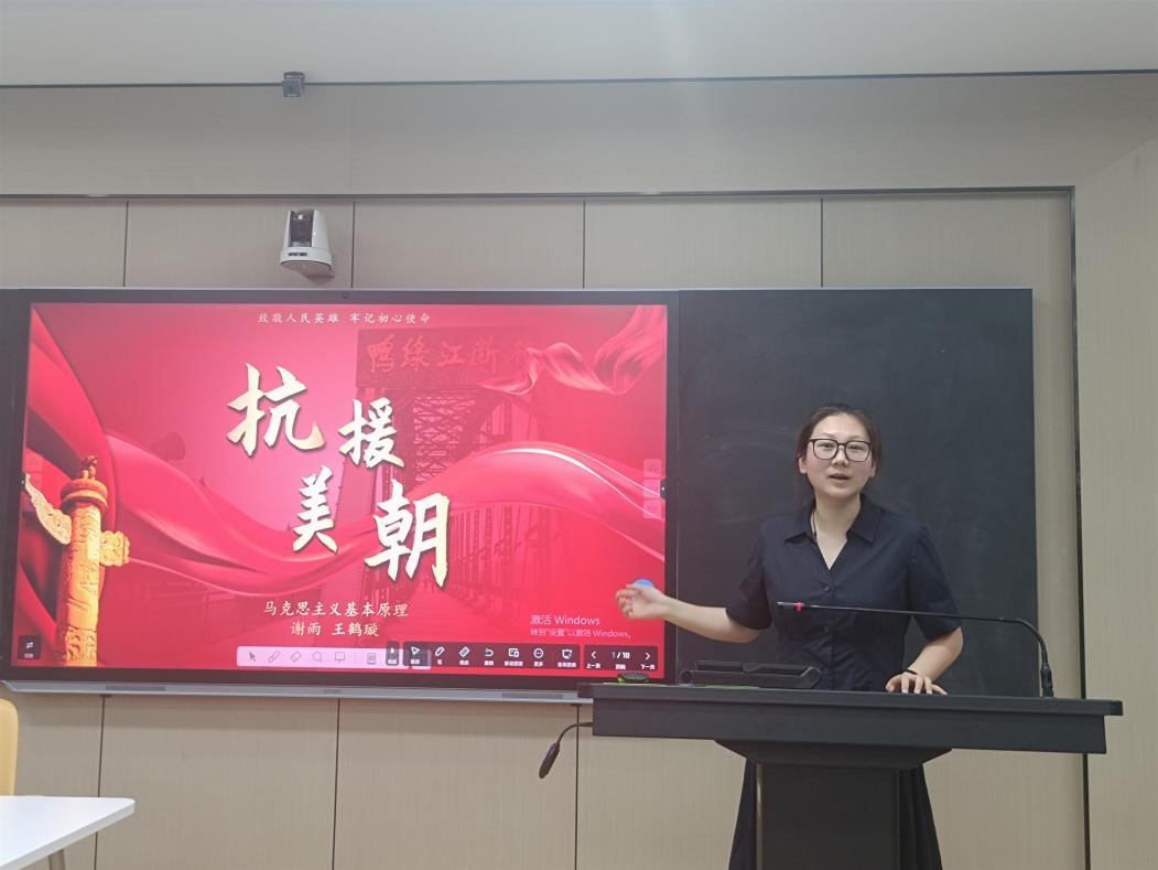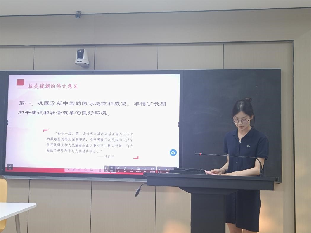 活动第二环节由马克思主义基本原理专业的谢雨、王鹤璇同学为我们讲解社会主义建设时期的历史。“宜将剩勇追穷寇,,不可沽名学霸王。”“雄关漫道真如铁,而今迈步从头越”。在新民主主义革命时期的青年故事中我们看到了他们的前仆后继、浴血奋战。看到了中国共产党领导中国人民抵御外敌,奋力抵抗的故事。“萧瑟秋风今又是,换了人间”“神女应无恙,当惊世界殊”。在中国共产党的领导下,在中国人民不畏艰难的斗争中,我们实现了站起来,实现了新民主主义革命的胜利。而此时,我们所面对的,既有国内恢复和发展经济,建设和发展社会主义的需要,又有国外反动势力对我们不断施压的局面。在谢雨、王鹤璇同学的带领下,我们再次学习了发生于该时期的抗美援朝战争中的中国精神。