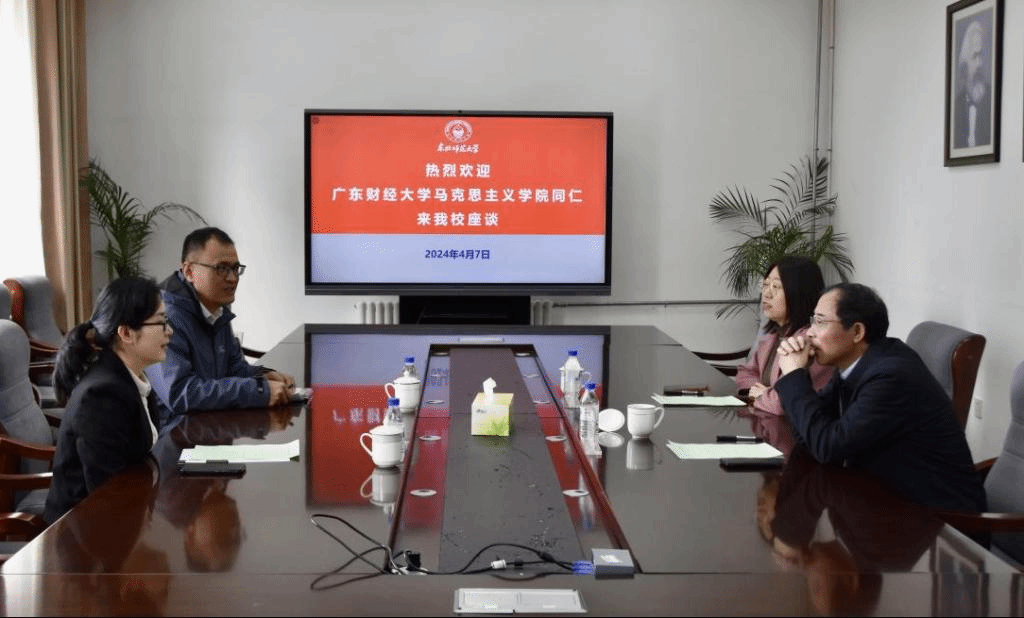 4月7日,广东财经大学马克思主义学院院长袁继红、副院长孙晓晖来四人麻将玩法 调研交流,四人麻将玩法党委书记孟宪生、副部长李爽参加座谈。