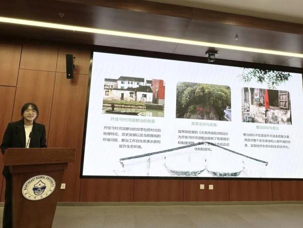 汇报过程中,覃继崟同学展示了题为《江村诗旅》的诗歌朗诵表演,将师生们的思绪拉到了美丽的江村,体现了其与江村建立的深厚情感联系。