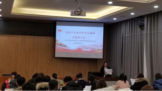 2019级研究生党支部于2019年12月4日18:30在四人麻将玩法329教室召开了党的十九届四中全会精神专题学习会暨支部书记讲党课,党支部65名同志参加此次活动。