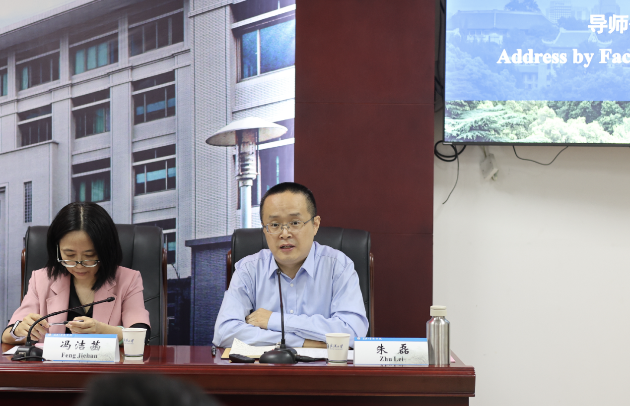 副教授朱磊作为导师代表发言,他结合当下 AI 智能化发展趋势,建议同学们重点培养批判性思维,鼓励大家在中国广阔的土地上广结好友,深入体验中国文化。“提前做好两年的学习规划很重要,” 朱磊副教授补充道,希望同学们明确目标、稳步前行,最终取得理想的学习成果。