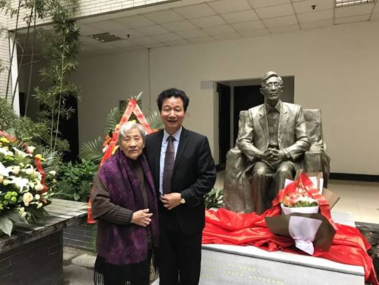 ▲ 2016年秦前红教授与师母赵宗荃在何华辉先生塑像前合影